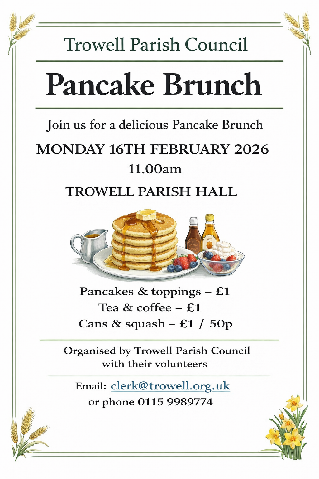 Trowell Parish Council will be hosting a Pancake Brunch at Trowell Parish Hall on Monday 16 February, starting at 11.00am.