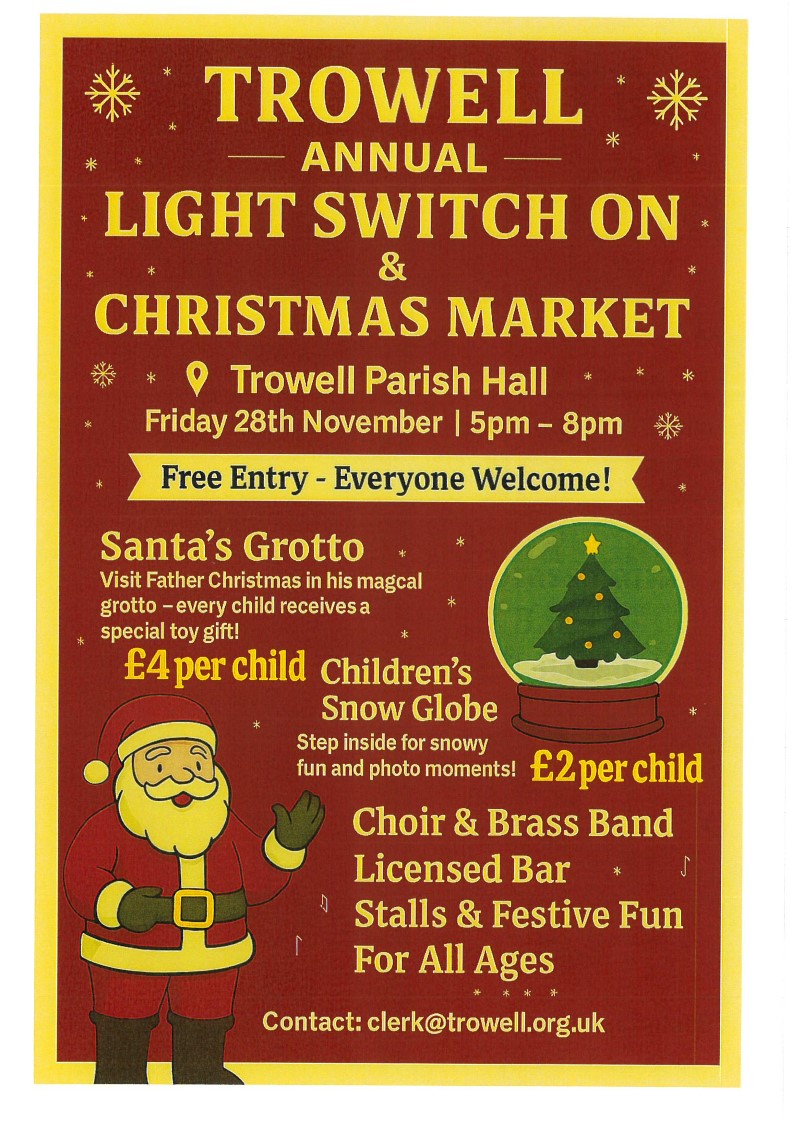 Trowell Parish Council is offering an SEN early-access session for Santa’s Grotto and the Snow Globe on Friday 28th November, from 4.30pm to 5.00pm.