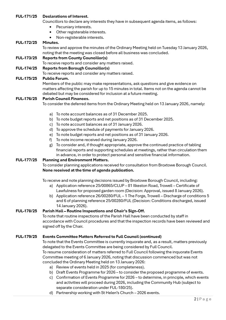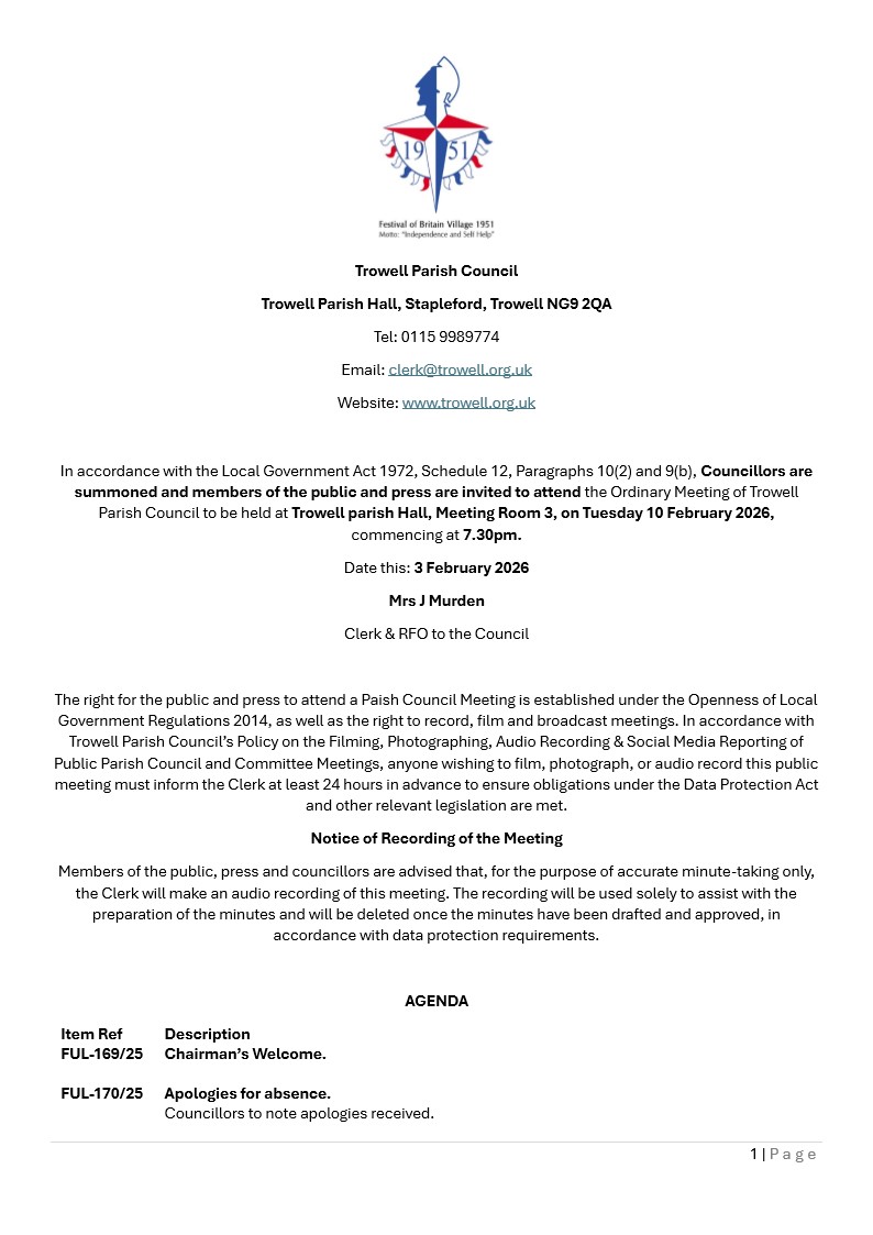 In accordance with the requirements of the Local Government Act 1972, NOTICE IS HEREBY GIVEN that a meeting of the Trowell Parish Council will be held on Tuesday 10 February 2026, at Trowell Parish Hall, meeting room 3, Trowell, commencing at 7.30pm.