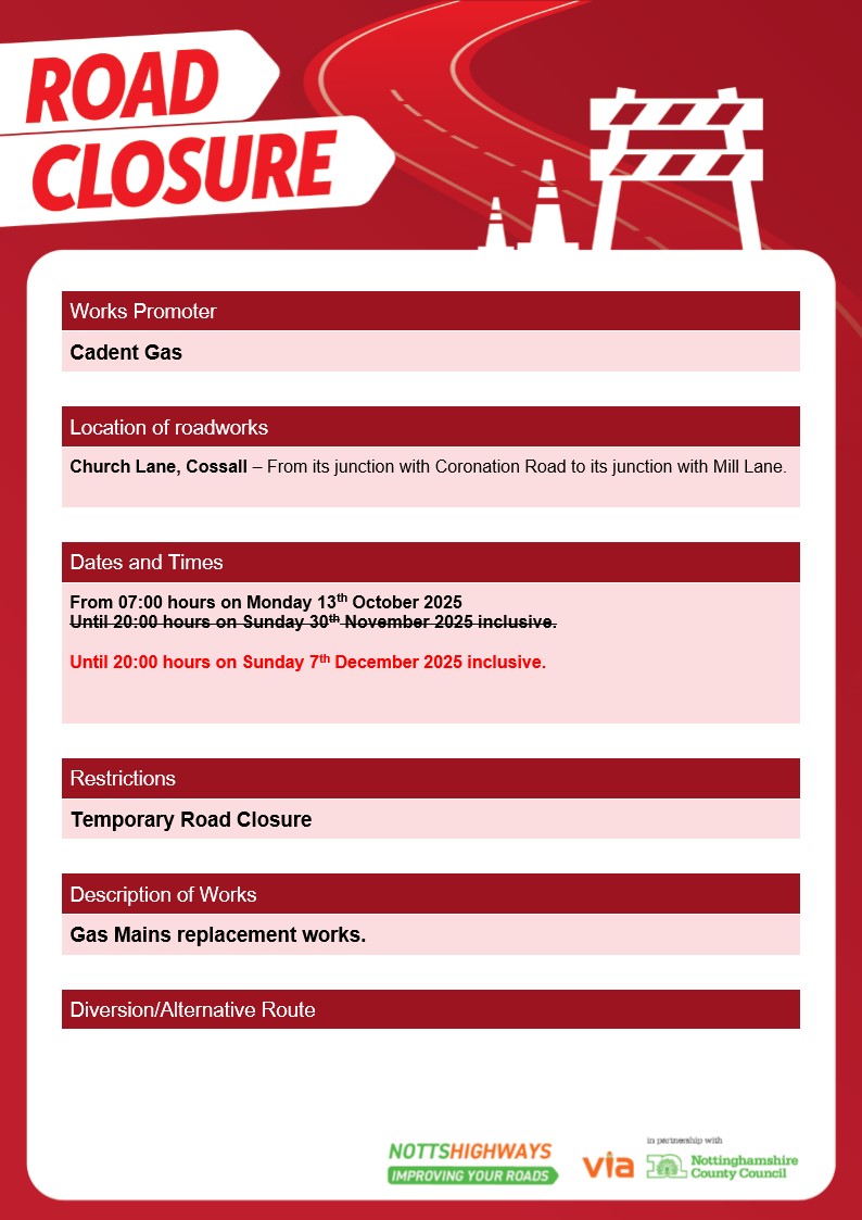 Trowell Parish Council has been notified of upcoming roadworks in Cossall, which—although outside the parish—are likely to affect residents due to increased traffic on surrounding routes.