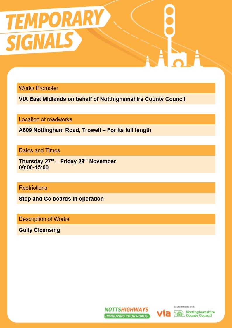 We have been informed by VIA East Midlands, on behalf of Nottinghamshire County Council, that temporary traffic management will be in place on the A609 Nottingham Road, Trowell, covering its full length.