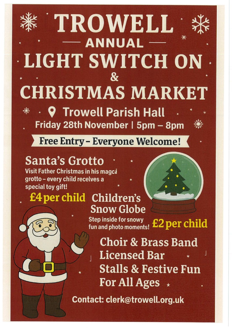 This Friday! Trowell Christmas Light Switch On & Market Posted on November 24, 2025 Posted in Parish News No Comments We’re counting down to one of Trowell’s favourite festive nights! Friday 28th November5pm–8pmTrowell Parish Hall Santa’s Grotto (£4 – includes toy gift!)Children’s Snow Globe (£2)Choir & Brass BandLicensed BarChristmas Market Stalls FREE entry — everyone welcome! Please share to help spread the word!