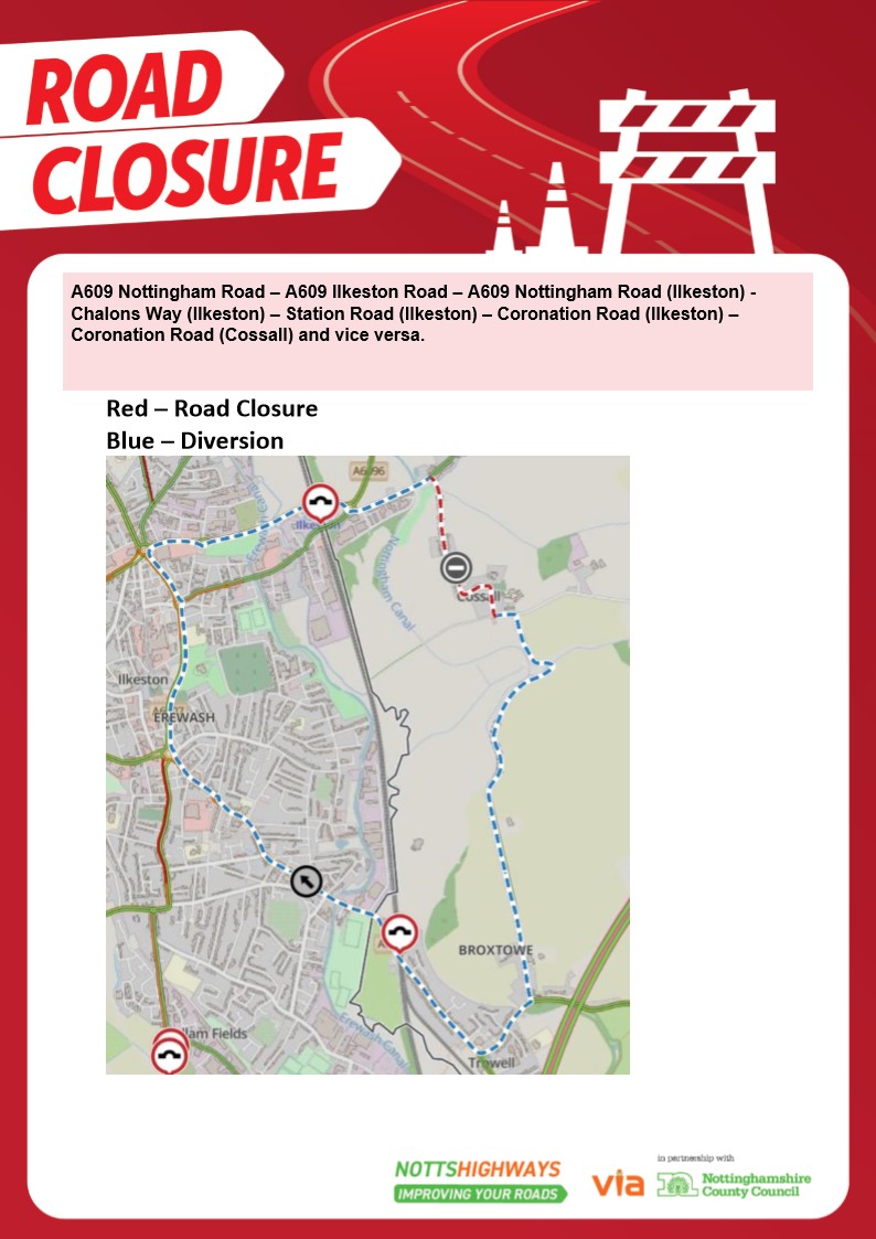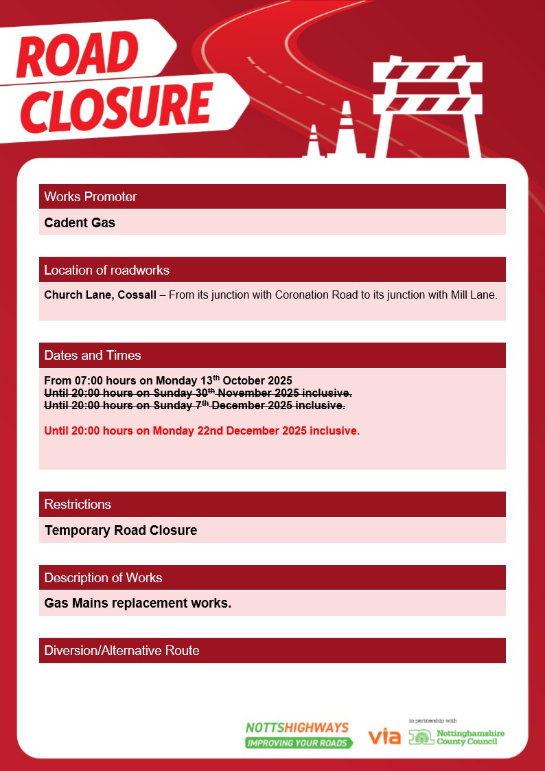 Via East Midlands have issued an updated notice for the temporary road closure on Church Lane, Cossall, due to Cadent Gas mains replacement works.