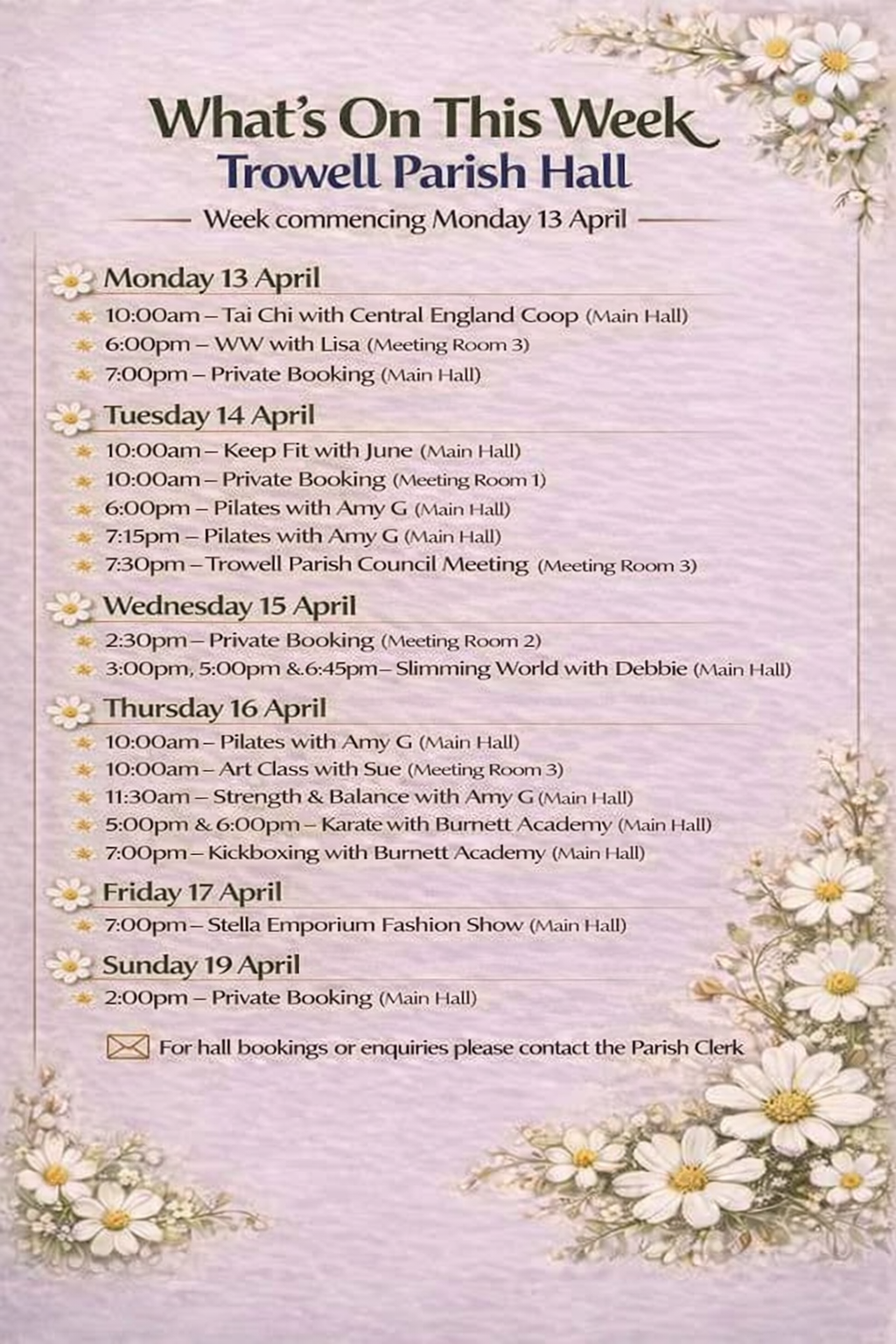 The hall will also host WW with Lisa and a meeting of Trowell Parish Council, alongside a number of private bookings, reflecting its continued use as a valued community venue.
